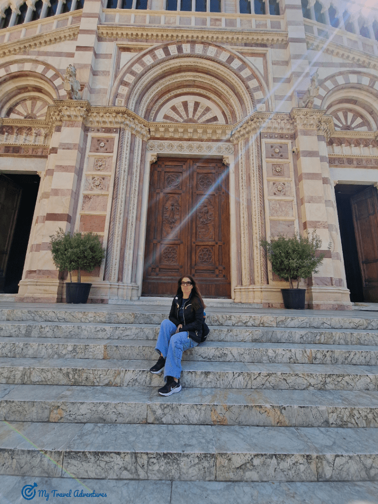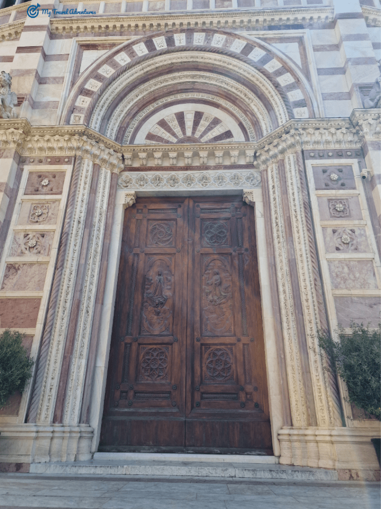 Едно от най-уникалните творения на площад Данте безспорно това е катедралата Сан Лоренцо. Тя беше първата сграда на този площад която ме впечатли с външната си архитектура. Тази фасада е построена между 1840 и 1845 г. на базата на романтичния вкус към двуцветното бяло и червено. Изградена е с три портала, а в горната централна част има кръгъл прозорец във формата на Розета. Камбанарията е издигната от лявата страна на катедралата. През 1911 г. тя е преустроена трансформирайки и приповдигайки двойните и тройните сводести прозорци. Пред катедралата има стълби, може да ги ползвате като пейка за почивка, ние доста си поседяхме наслаждавайки се на слънцето и преминаващите хора.
