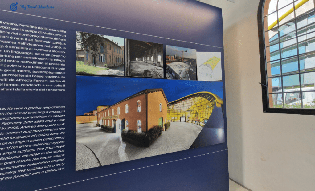 Работата по проекта започва през 2009 г като включва – допълнения към изграждането на музея, обновяване на къщата-работилница, където всъщност е роден Enzo Ferrari и в последствие работи. Площта е от общо 5000 кв. м с вътрешния двор, като 3000 са отделени за изложбената част, залата за събития, кафенето и магазина. През 2012 г музеят е официално открит, но две години по-късно поради реорганизация на музеите той бива временно затворен. През 2015 година музея отново отваря врати и минава под ръководството на Ferrari, като едновременно се комбинират с историческия музей на Ферари в Маранело.