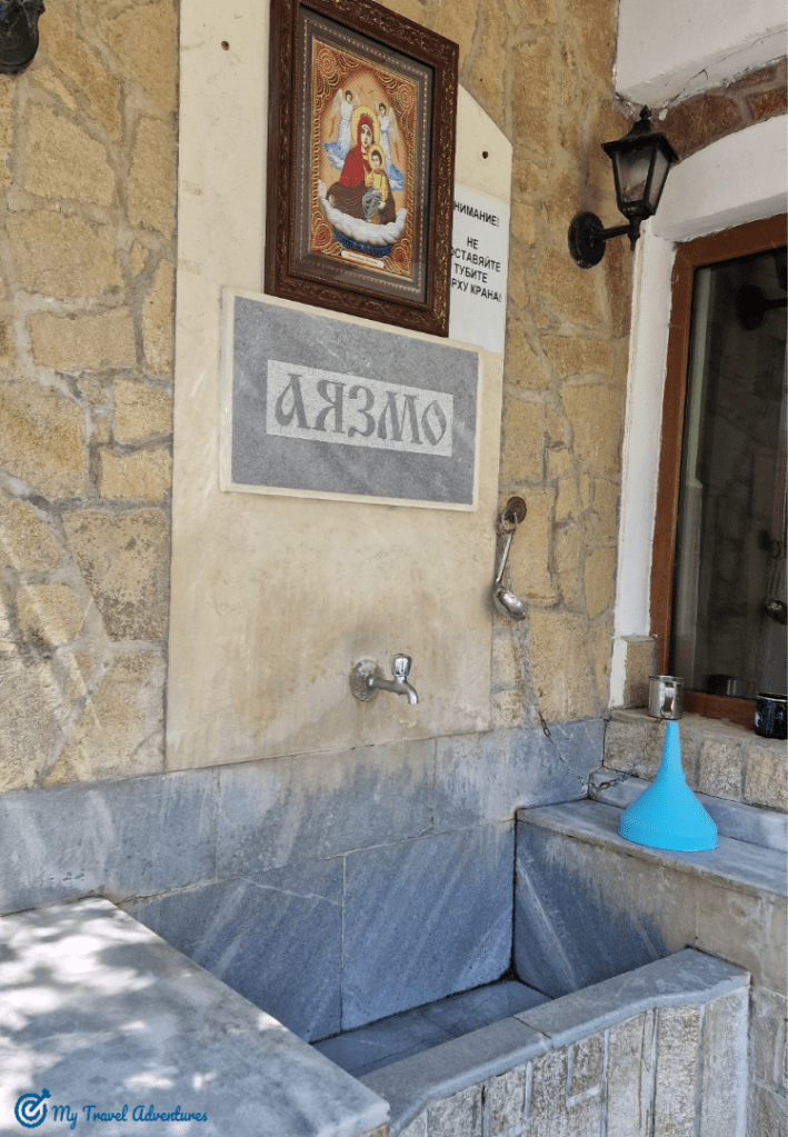Когато минете през входа на манастира се открива зелена градина и пътека водеща към входа на манастира. Отминавате входа, след това кръщелната зала – направо я заобиколете и минете от задната и част. Тук ще видите още една трета врата която ви води в къпалнята, където може да се изкъпете с лековитата вода. На гърба на къпалнята ще видите аязмото, на пръв поглед една обикновена чешма само че с течаща лековита вода. Може да напълните колкото бутилки желаете, водата е напълно безплатна. И нещо много важно – задължително е да си измиете лицето с вода, казват че водата освен че лекува болести и рани тя пречиства и вашето съзнание.