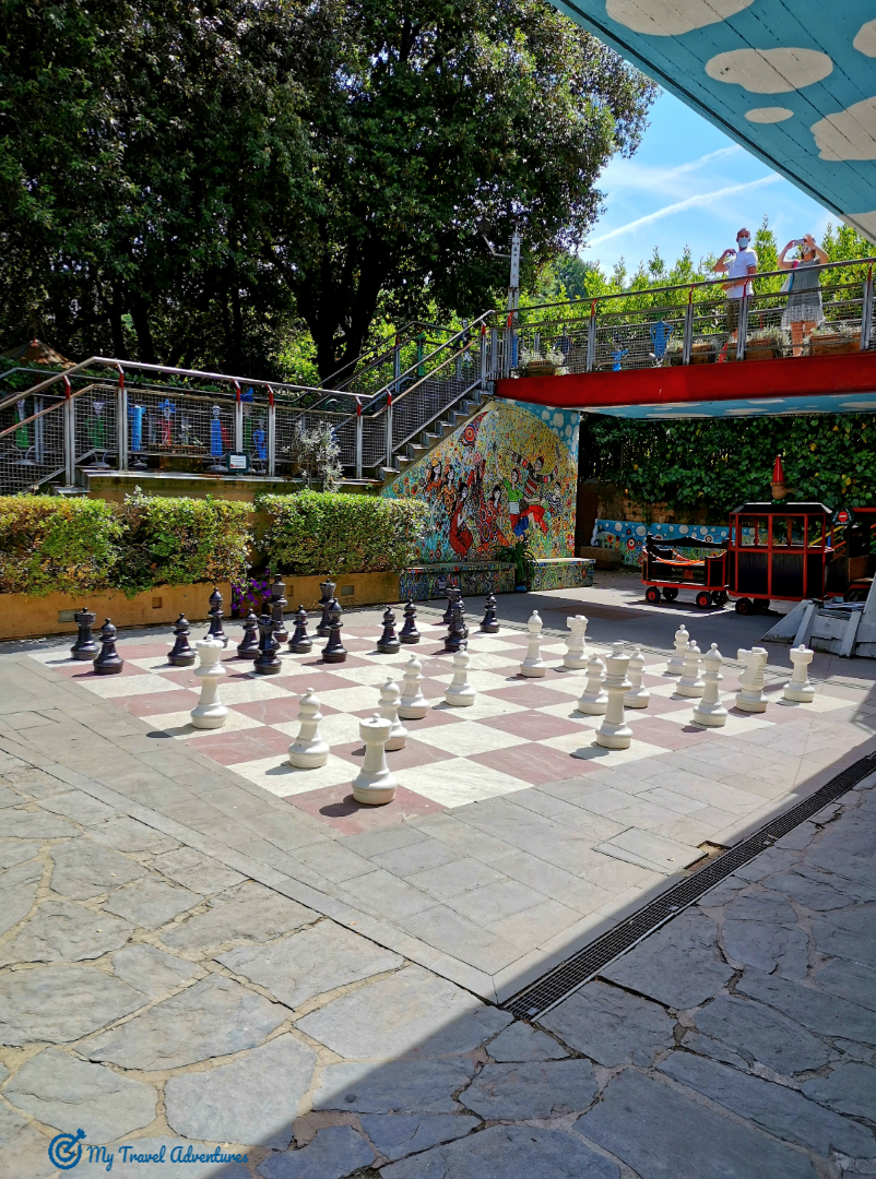 Започваме с атрактивния музей на Пинокио. Той се намира точно след входа и касата за билети в дясно. Вътре ще откриете технологични инсталации за историята на Пинокио и различни игри свързани с приказката. На излизане от музея се натъкваме на най-забавната и най-атрактивната зона за мен, нарисувания шах и дървените пешки, изработен така че може да стъпвате отгоре му и да местите фигурите. Терасата която виждате е с изглед към част от парка, а в тревата е изобразено лице от пясък на пеещ Буратино, които огласява наоколо с песните си. По оградата на стълбите са наредени различни орнаменти изработени на ръка, свързани с тематиката на приказката.