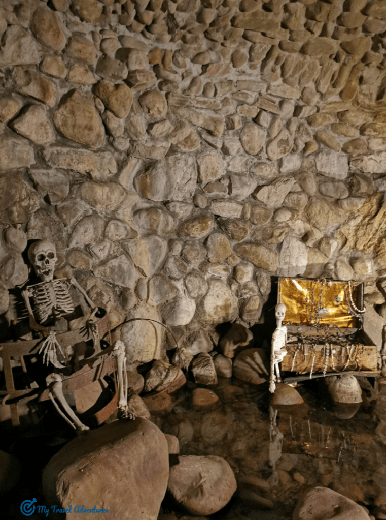 В голяма близост до кораба ще откриете пещера, а вътре сандъци със злато (не истинско) и скелети (по подобие на човешки скелети). По скоро ми прилича на изоставена пиратска пещера. Вътре е тъмно студено и има запалени свещи навсякъде около сандъците със злато. А само на няколко крачки по напред се намира парка за авантюри. В парка за авантюри се допускат деца над 5 г и с височина от 1 до 1,5 метра. Преминава се през въжен мост над реката. А знаете ли коя е любимата игра на Буратино? -Въртележката с числата.