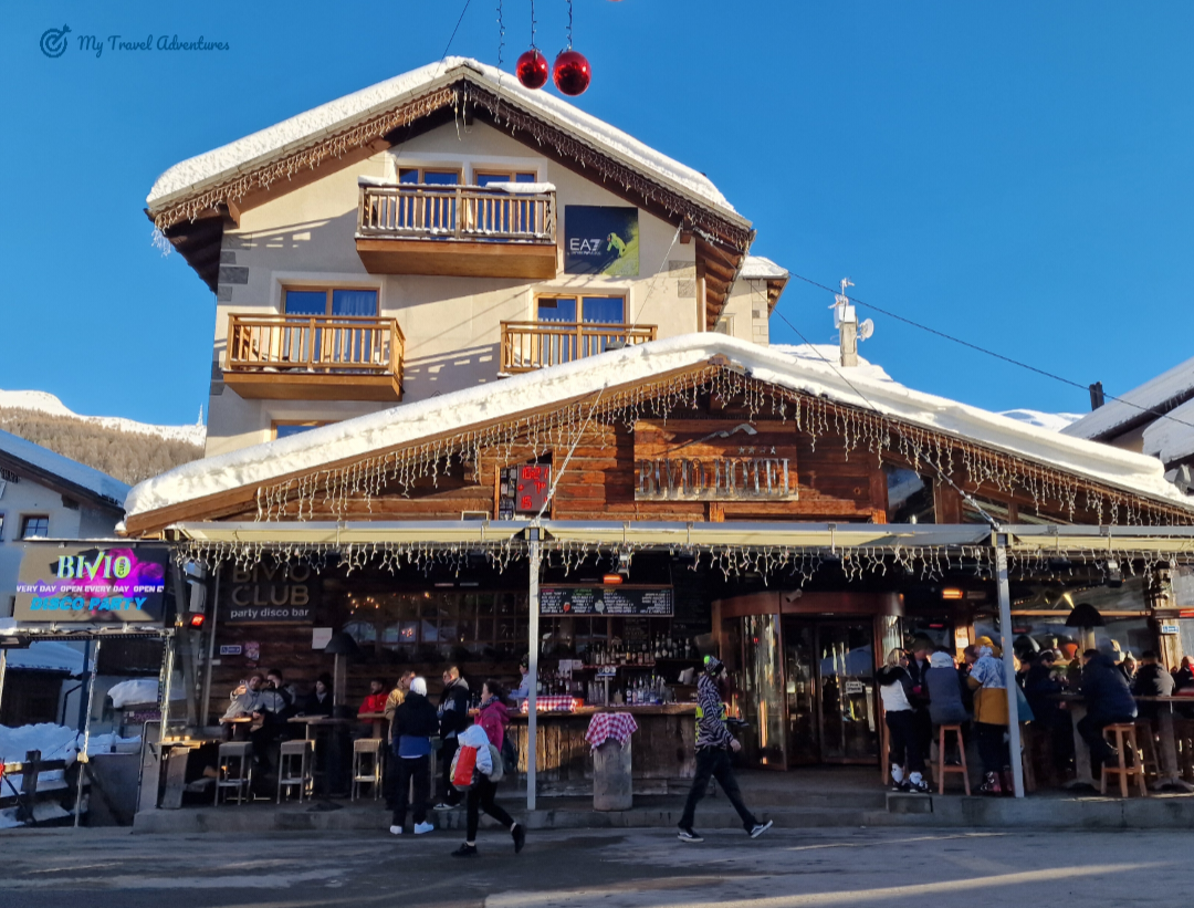 Ливиньо е претъпкан с барове и нощни заведения, а дискотеките започват в 20.00 часа вечерта. Никога не съм си и представяла, че мога да отида на дискотека толкова рано, но е факт. Усещането за нас беше различно защото знаехме че сме в планината на парти, а наоколо преспи сняг, ниски температури, студено, а в ръката чаша червено вино. От самата писта със скиорските дрехи и сноуборд в ръка пристигаха туристи да се забавляват, което допълнително допринасяше за нашето позитивно настроение. В този момент на никого не му пукаше как е облечен и с какво идва. Имаме много положителни точки за града като цяло. Дискотеката се намира в долната част на хотел Бивио или ваше ляво където се намира и светещата табела с надпис Diso Party.