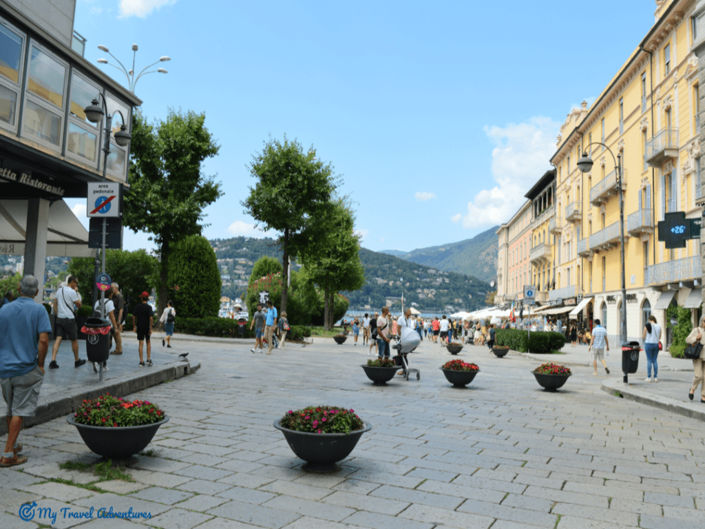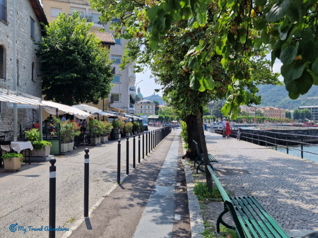 Едно от най-приятните неща за правене тук е да се разходите около езерото Комо. По пътя си ще срещнете исторически вили, паметници, многобройни ресторанти и уникалната панорамна гледка към Алпите и езерото Комо. Ние винаги паркираме на паркинга до Паметника на загиналите и нашата разходка започва от тук. Следва музей Волтиано и до него се намират зелените градини на езерото Комо. Докато вървите по пътя си от ляво ще видите дълъг мост водещ до вътрешността на езерото, а няколко крачки след това от дясно ще видите площад Кавур. След площад Кавур се намира и гарата в случай че имате нужда да се качите на влак. Ако сте стигнали до гарата значи със сигурност сте преминали и през малките пристанища от където потеглят корабите. Следват още крайбрежни заведения за хранене, уникални гледки и след това идва ред на въжената линия водеща към Брунате.