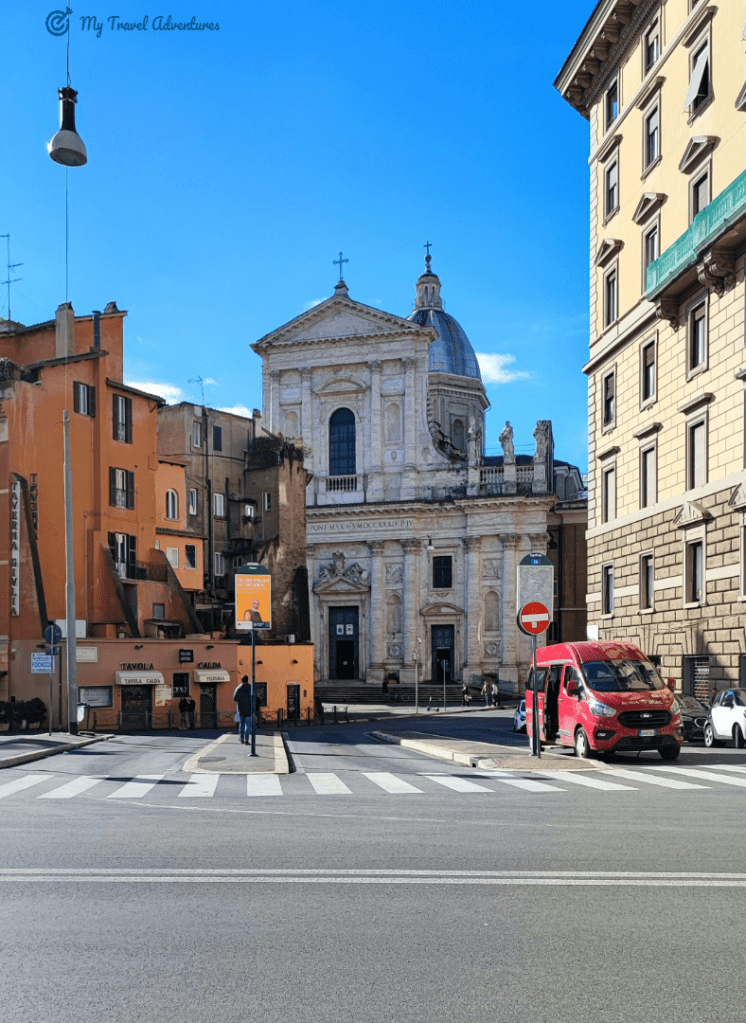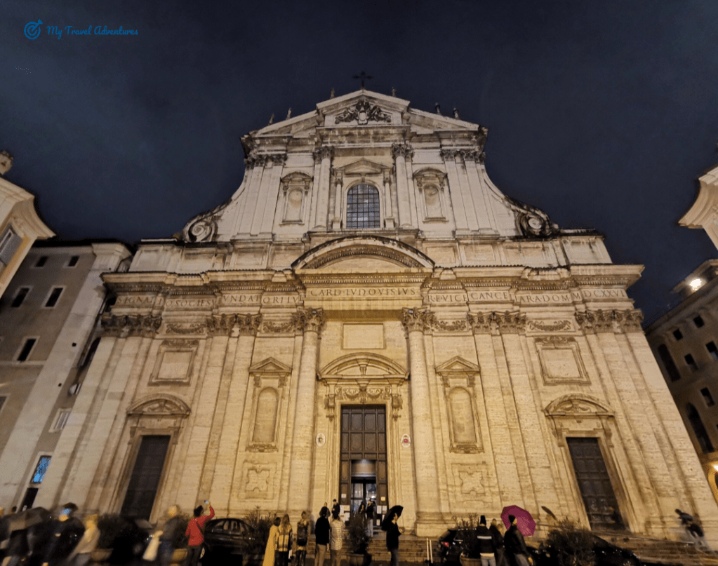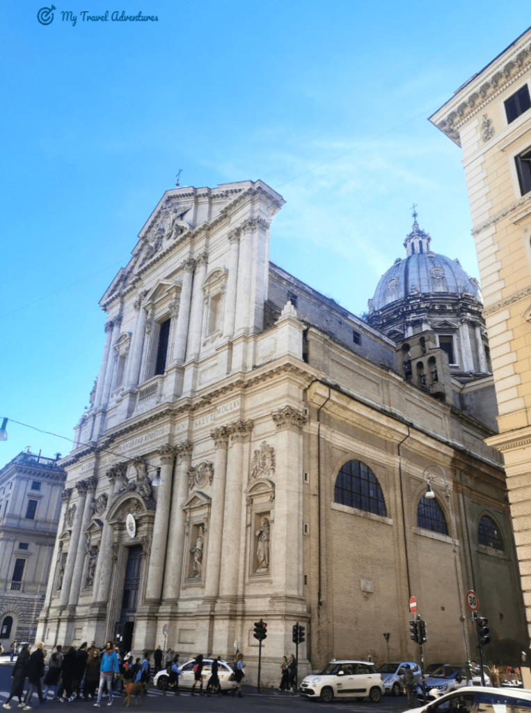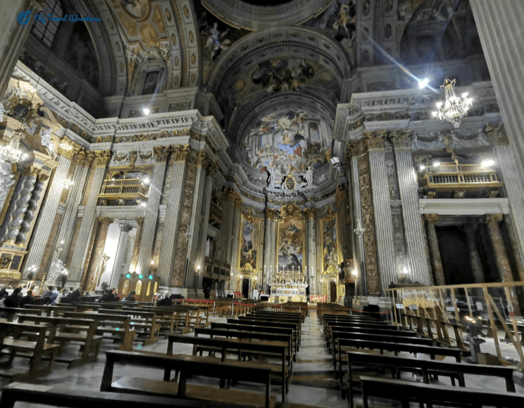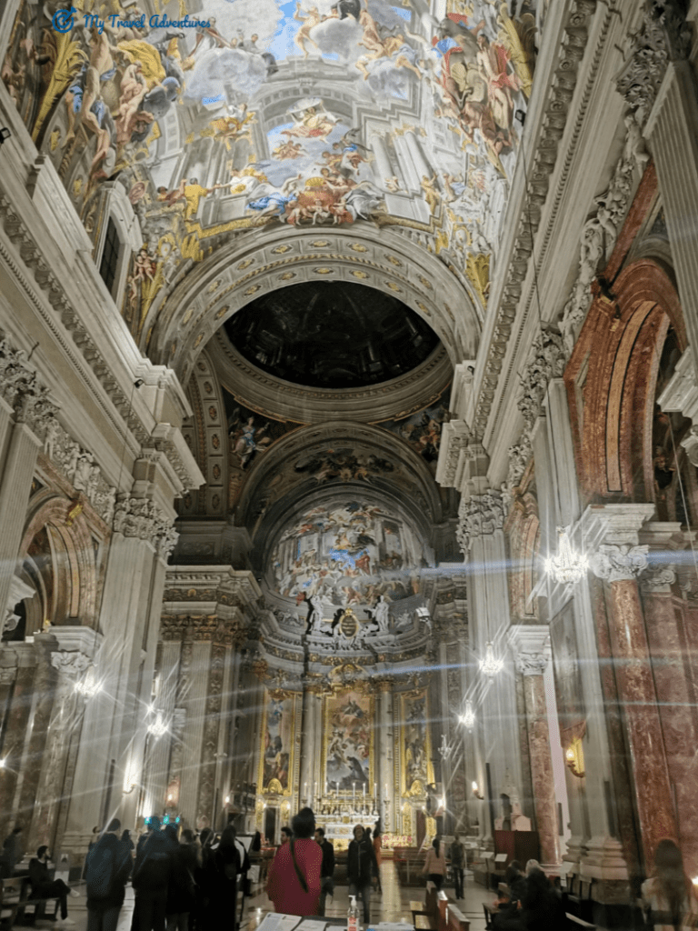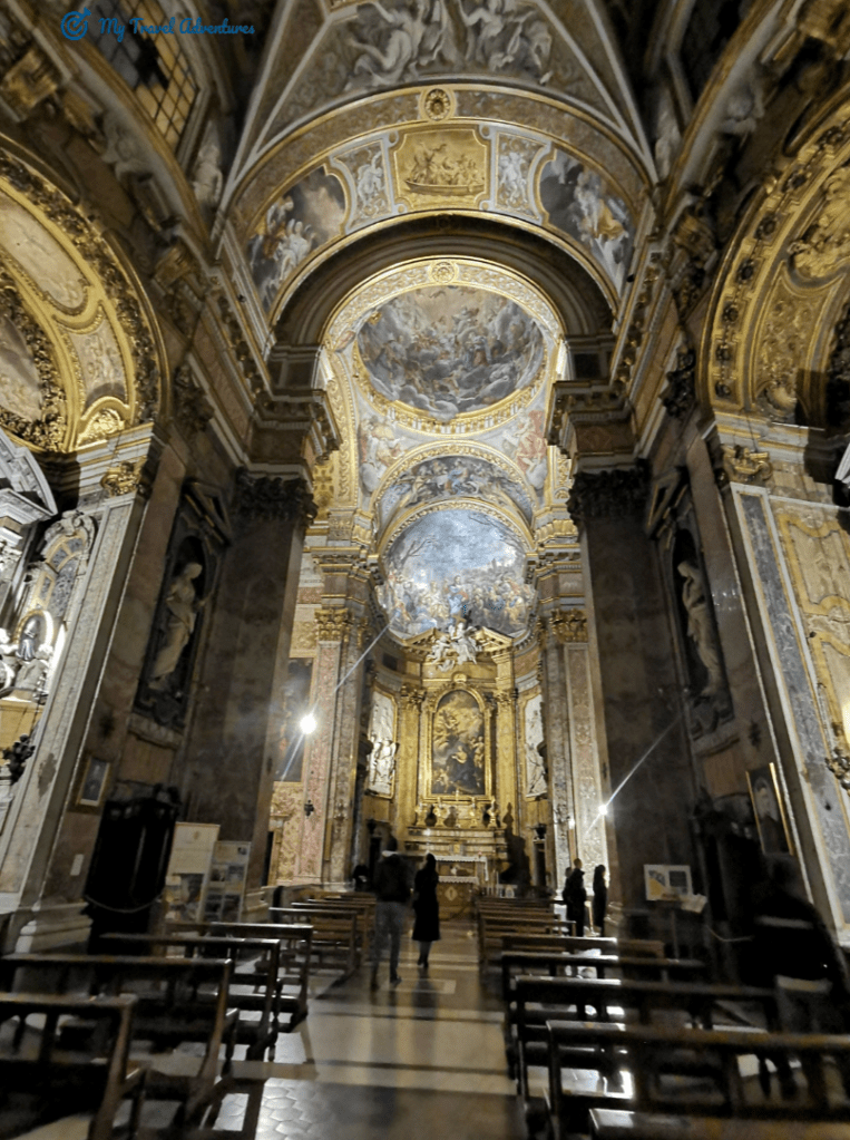 Църквата е посветена на Свети Игнацио, основателят на йезуитския орден. Открихме тази църква на пътя между Пантеон и Фонтана ди Треви. Тъй като се редяха хора на опашка, решихме и ние да влезем и да я посетим от вътре. Църквата е построена на мястото на друга древната църква „Благовещение“. Още при самото влизане се чуваше тиха църковна музика, а хора се редяха на опашка и се вглеждаха в едно огледало. После разбрах че огледалото приближава илюстрацията изобразена на тавана наречена – „перспективния плафон“ извършена от архитект и художник Андреа Поцо. Темата на изображението е обожествяването, възнесението на главата на йезуитския орден Игнатий Лойола на небето.