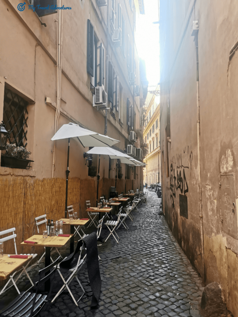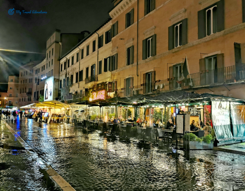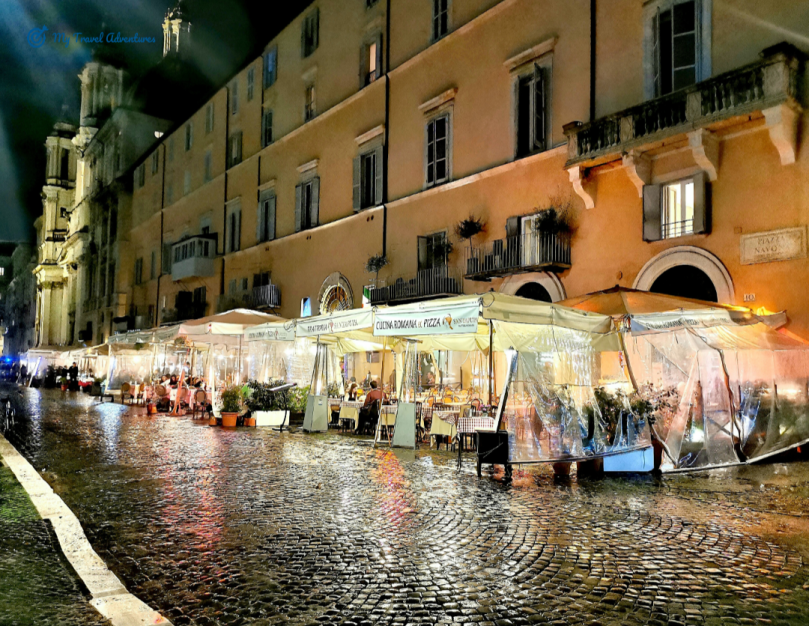 Посетете италианската столица когато имате време, възможност и желание. По всяко едно време на годината Рим е прекрасен. Сами виждате, дори да вали пак е възможно да вкусите от ароматното вино и да се нахраните на открито. Рим е туристически град и е пълен с много туристи, а собствениците на заведенията за хранене са добре организирани. Пред всяко едно заведение е изграден найлонов навес които предпазва от дъжд. За по зиморливите има поставени печки които затоплят достатъчно. Преди да седнете може да погледнете цените на менюто поставено най-отпред. Предупреждение! Контролирайте цените на външното меню с цените на това което ви дават вътре, възможно е да се различават. Едното меню е за туристи а другото за италианци. Знам че звучи прекалено, но е истина. 🧐🤫