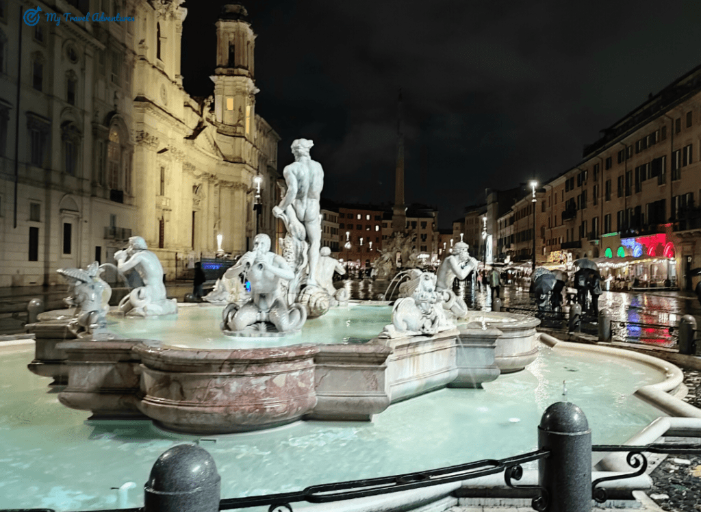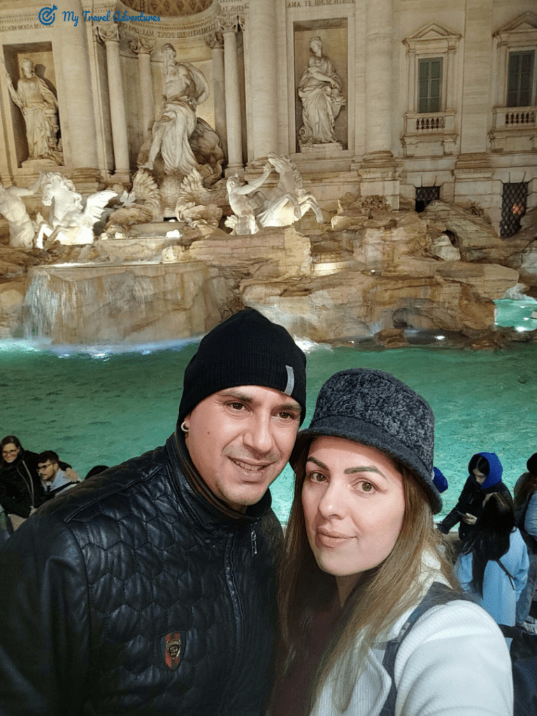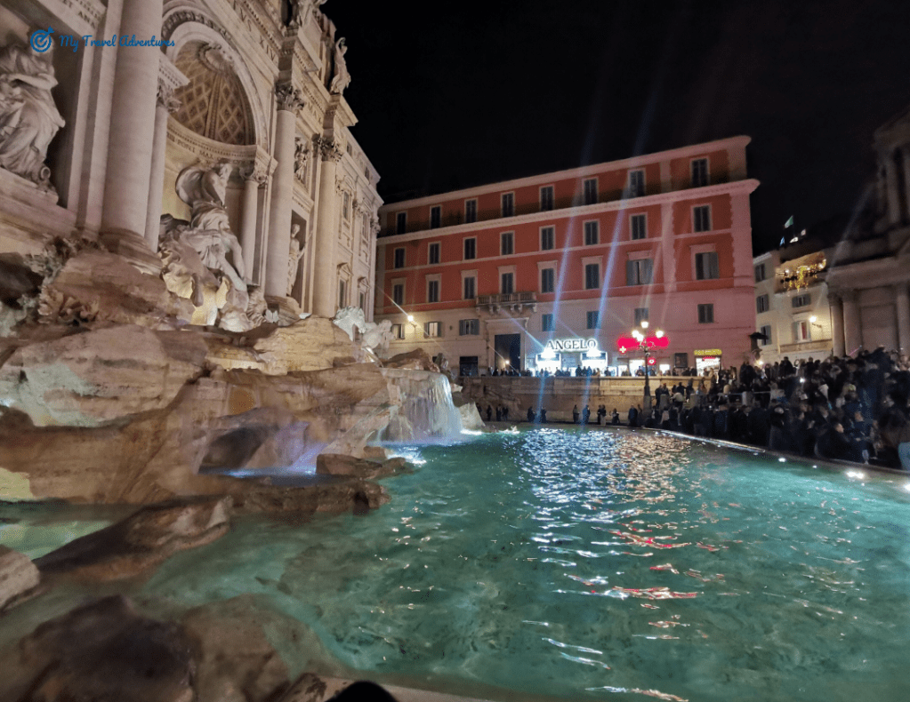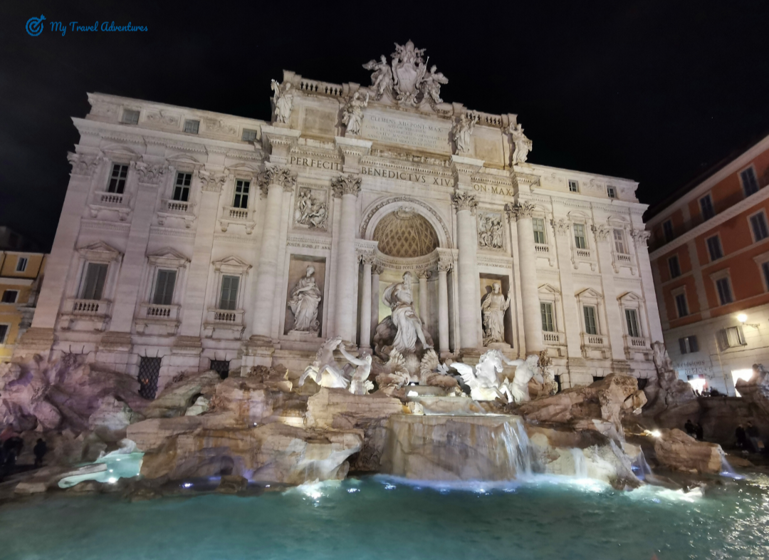 Следва Фонтанът ди Треви най-големият фонтан в Рим, но въпреки големината му съвсем не е лесно да бъде открит ако не ползваме навигация, тъй като се крие между сградите на площад Треви. Наименованието на фонтана идва от самото му местоположение, буквален превод „tre vie“ означаващ „три улици“, които се срещат точно на фонтана. Построен е през 1762г. от Никола Салви. За него съществуват няколко легенди!