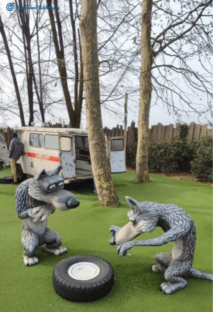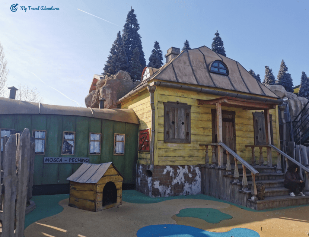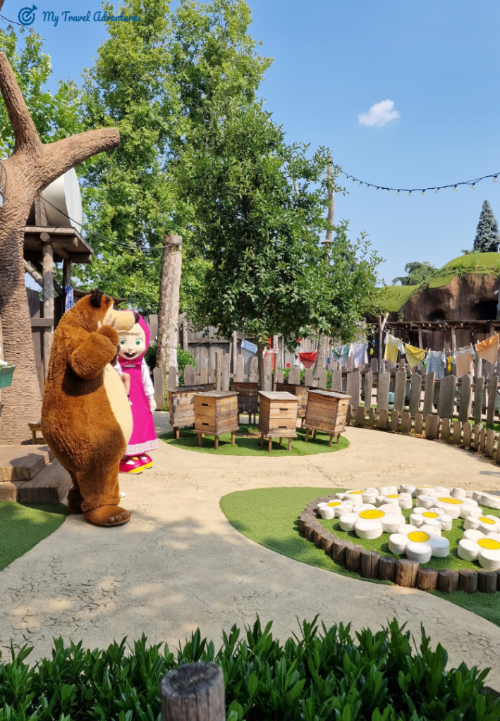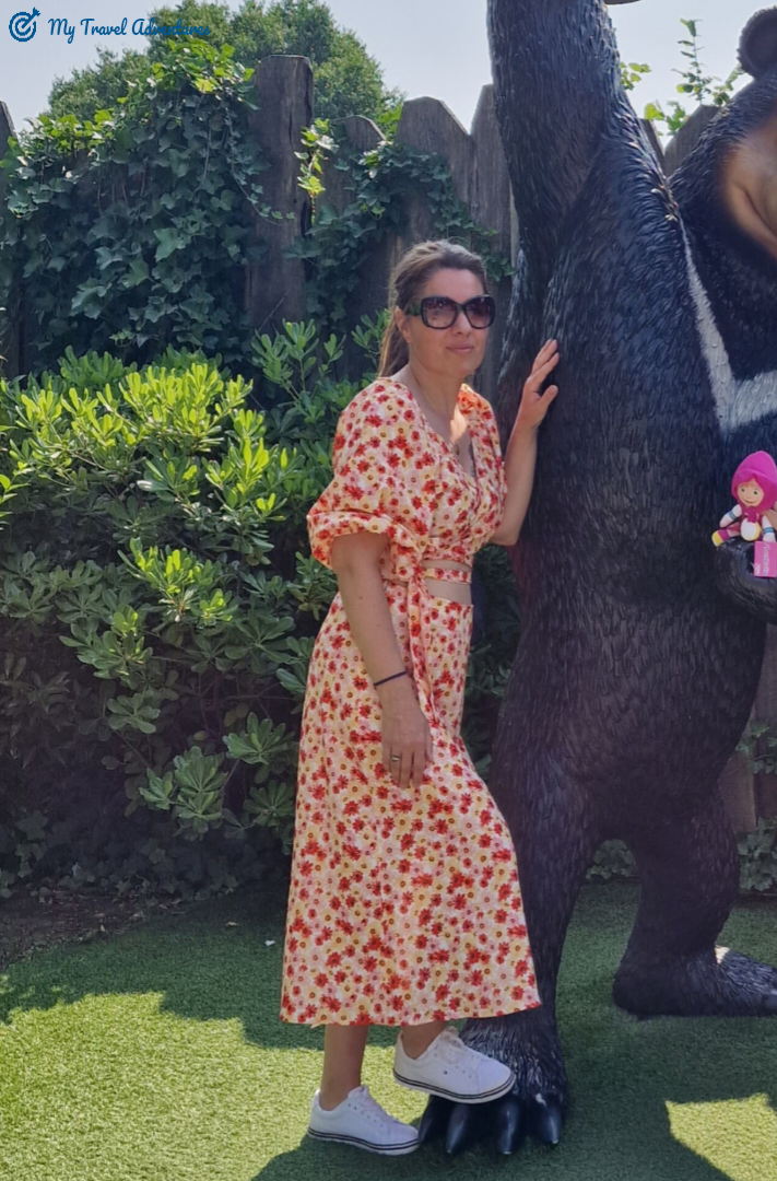 За любителите на Маша и Мечока посещението на къщата на мечо, къщата на Маша, двора и линейката с гладните вълци е задължително. Поиграхме си в двора на Маша, а малките се пускаха по пързалките, наслаждавахме се на приказната атмосфера. Пробвахме да влезем в къщата на Мечо, но беше заключено, a за сметка на това неговата външна баня беше отворена. Толкова емоции да влезеш в банята на Мечо, но вече е време да седнем и да се насладим на шоуто което ни предстои.