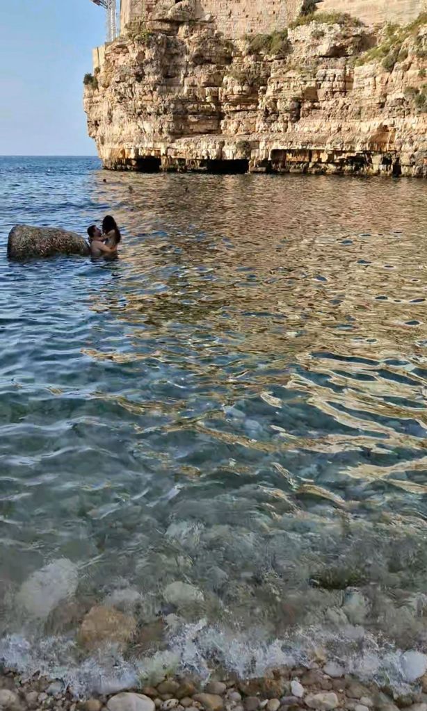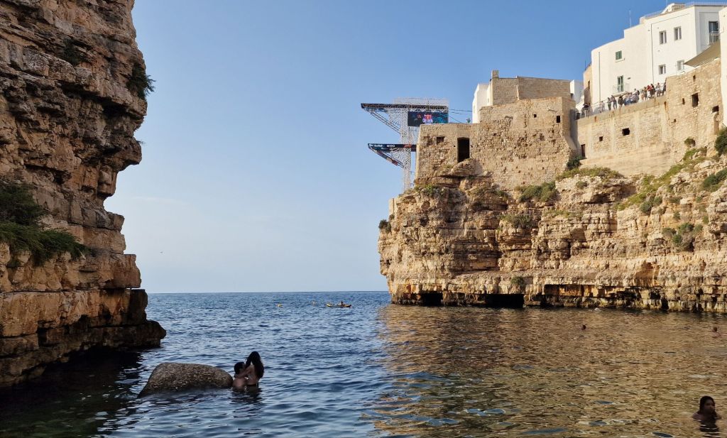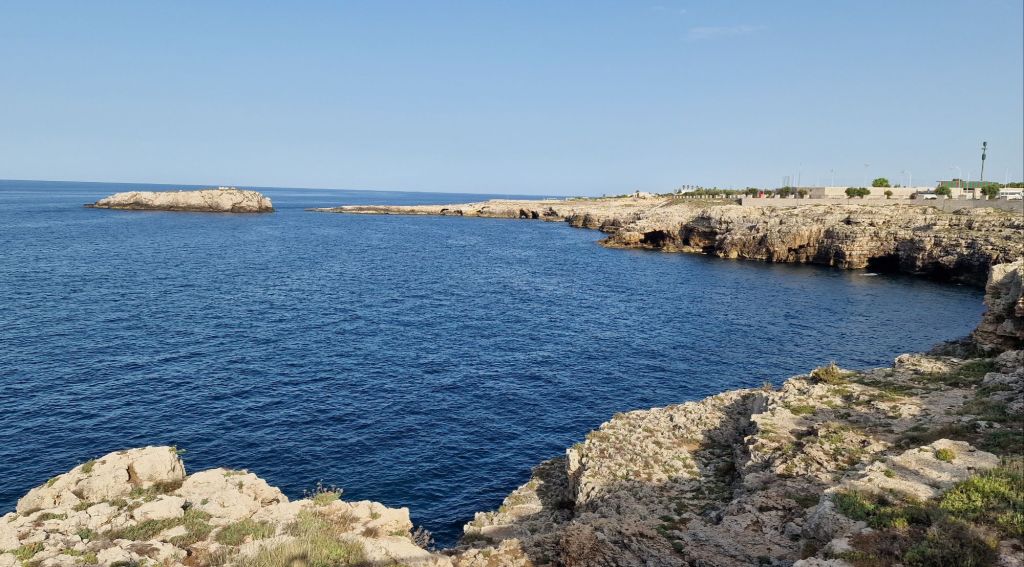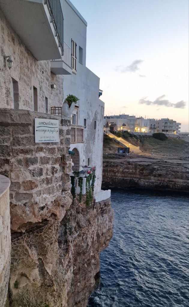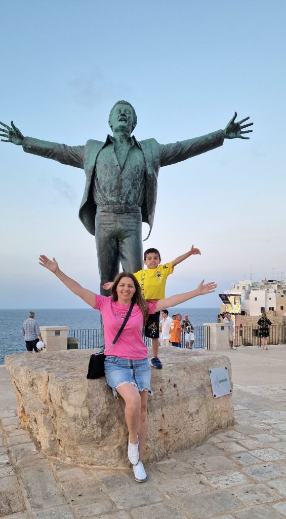 Продължаваме отново и след няколко минути се озоваваме при статуята на певецът Доменико Модуньо която трябва да добавите в списъка с задължителни места за посещение в Полиняно а Маре. От тук може да слезете до скалите по широко стълбище наречено „Воларе“- отново почит към великия певец и да се оставите да бъдете завладени от движението на вълните разбиващи се в брега. Ако се насочите на дясно и започнете да се приближавате все повече и повече, ще видите великолепна гледка към селото може би най-известната където очите ми най-накрая виждат на живо това което досега беше една проста снимка – сградите чиито основи принадлежат на морето дотолкова, че можеш да предположиш съществуването на подводен Полиняно. Докато се наслаждавахме на залеза се сбогувахме с морето, селото и поезията на Модуньо. Полиняно несъмнено ни спечели!