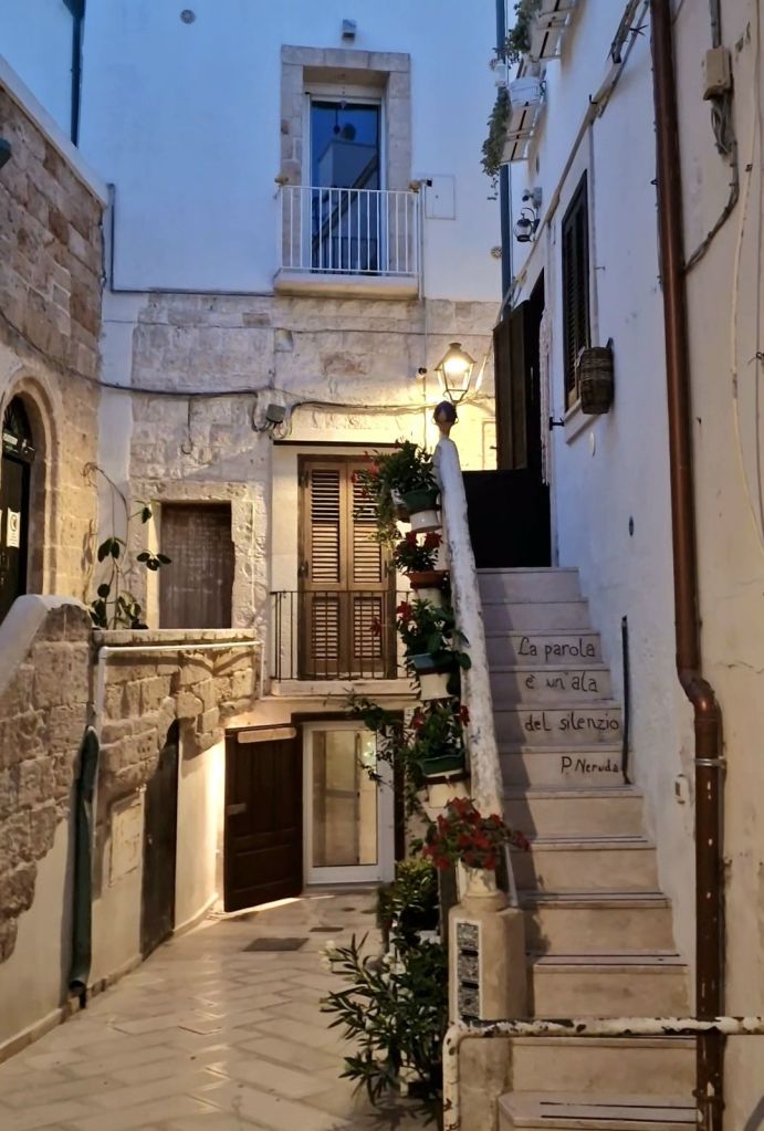 Различните култури които са пресичали Полиняно през вековете – арабска, византийска, испанска и римска все още се виждат в центъра на града. Тук белите къщи съжителстват с улици които сякаш се съпротивляват с хода на времето, предлагайки уникален и поетичен щрих. Какво имам в предвид? Историческият център на Полиняно е обогатен от стихотворения написани от Гуидо – известен като Фланер. Тези стихотворения са разпръснати на всеки ъгъл в града, по стените и по вратите на къщите придаващи не само уникалност на мястото, но и приканват посетителите да открият района от различен ъгъл. По този начин всяко кътче на историческия център прави атмосферата на Полиняно още по-вълшебна.