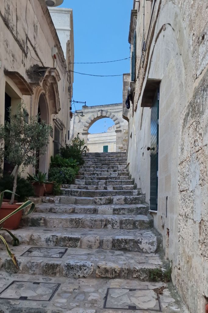 Вървейки по улица Via d’Addozio ще можете да се наслаждавате на панорамата на града и парка Murgia Materana от ляво, а вървейки по пътя от дясно ще видите църквата San Pietro Barisano, най-голямата скална църква в Матера разполагаща с подземни проходи (информация и билети тук ). След като посещението на църквата приключи имате два варианта: да се разходите по Via Madonna delle Virtù заобикаляйки града и любувайки се на панорамата от ляво и на селищата датиращи от палеолита и неолита или да се изкачите по каменните стълби и да се потопите в историята на старият град както направихме и ние.