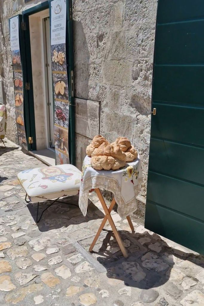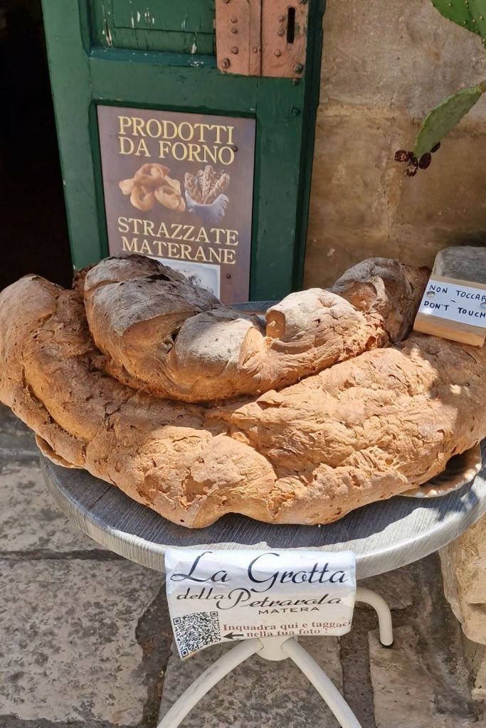 Матера не е известна само заради древният град Sassi di Matera, но и с автентичният си хляб. С форма на питка напомняща камъни и пещери, тя е направена от твърда кора (наречена grano duro) от района и подготовката на кваса следва определен процес на приготвяне. Всичко това се превръща в уникален вкус и разкошна хрупкава коричка. Обикновено се сервира като сандвич (въпреки че ние наистина се наслаждавахме само на хляба), можете да го напълните с печен патладжан, тиквички, сирене, песто и сушени меса.