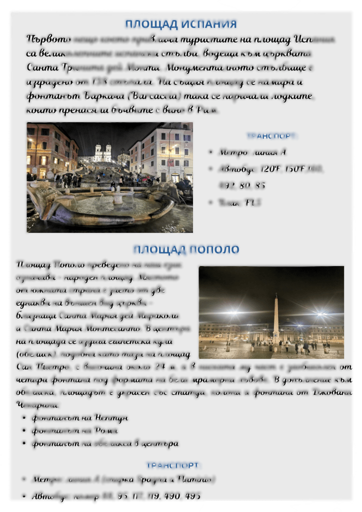 • Със сигурност вече знам къде ще пътувам (град, район) и избирам начина по които ще стигна до там. Тук става въпрос за Италия и вече знаете, че ние пътуваме с кола и ми е по лесно, но ако става въпрос за друга държава ще трябва да се справя със самолетни билети и градският транспорт (билети, цени, място и карта на метрото). Вече знам колко ще ми струва пътят до Рим и на колко километра се намира от моето местоположение. Единственото неудобство беше, че имахме само два дни за престой, а пътят до столицата е на около 6 часа. Така трябваше да се организираме, че да имаме време да пристигнем, да обиколим отбелязаните места и да се върнем обратно в Милано. И колкото и непосилно да изглежда всичко – Успяхме, но без да посещаваме музейте и замъка от вътре. Точно поради тази причина е необходим план и необходимото време за да посетите всичко което искате.